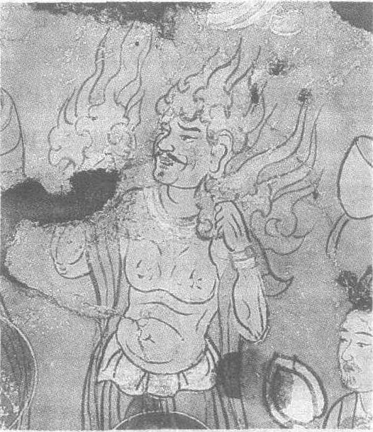 | 释义 | 火头明王及供养人像壁画 火头明王及供养人像壁画北魏。甘肃省天水市麦积山石窟第78窟壁画。画面上火头明王佩项圈、戴手镯,浓眉、大眼、高鼻、八字须、上身裸体,露出块块肌肉,下围长裙。双手握拳,举至肩部。臂缠飘带,双臂粗壮,其头上及双肩烈火熊熊。运笔粗犷,婉转多变,以显示其刚劲,有力。图的右下角为一男供养人,头戴花冠,脸形椭圆,相貌清秀,举莲蒂一枝。其形象文质彬彬,神态虔诚无比。面敷粉白,与黑色胡须和朱唇反差强列。图中的两个人物外形乃至气质都有鲜明的对比。专家认为,通过这幅图可说明甘肃东部的早期石窟艺术要比河西一带更具民族传统绘画的特色。此图为本世纪70年代清理而出,色彩浓厚,鲜艳如新。