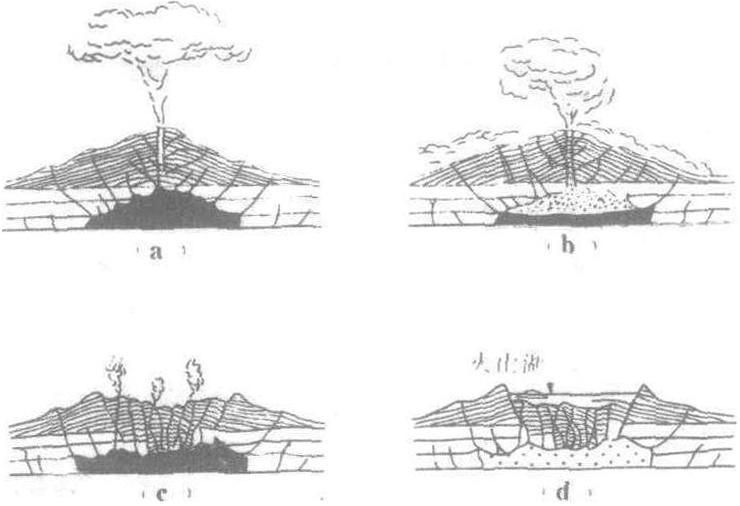 图3 火山口的演化 (a)、(b)火山喷发后,使下部岩浆减少,形成空洞 (c)下部失去支撑,引起上部崩塌,形成破火口 (d)在破火口中积水成湖。 ☚ 半岛 水文 ☛ |