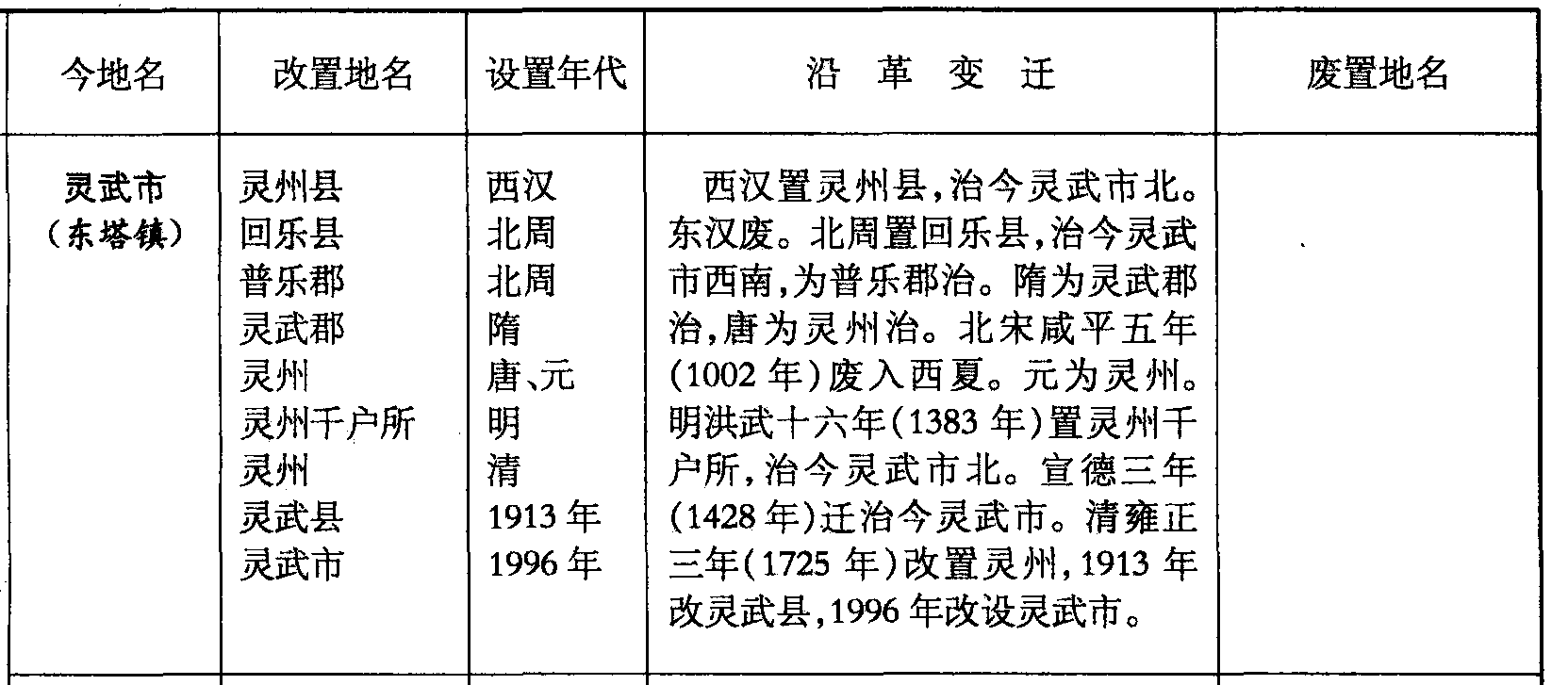 西汉置灵州县,治今灵武市北。东汉废。北周置回乐县,治今灵武市西南,为普乐郡治。隋为灵武郡治,唐为灵州治。北宋咸平五年(1002年)废入西夏。元为灵州。明洪武十六年(1383年)置灵州千户所,治今灵武市北。宣德三年(1428年)迁治今灵武市。清雍正三年(1725年)改置灵州,1913年改灵武县,1996年改设灵武市。