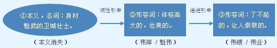 字源解说 韋,既是声旁也是形旁:甲骨文字形 像士兵沿着城邑 的四周巡逻 守卫。伟,篆文 = (人,士兵)+ (韦,卫城),造字本义:身材魁武的卫城壮士。俗体楷书 利用草书字形 将正体楷书 的“韋” 简化为“韦” 。 附 文言版《説文解字》:偉,奇也。从人,韋聲。 附 白话版《说文解字》:伟,特别高大的身材。字形采用“人”作边旁,采用“韦”作声旁。 引申线索