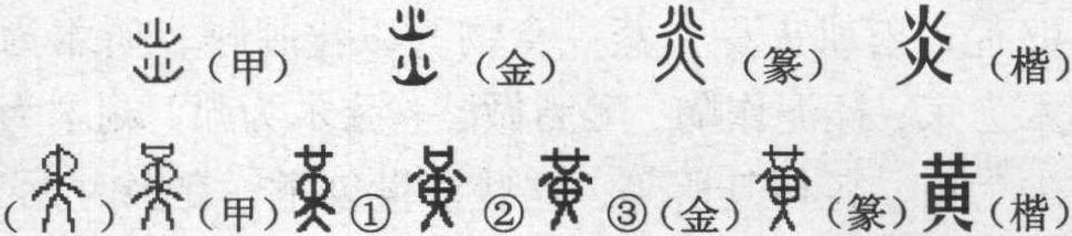 传说中的炎帝神农氏 据考证,农村现今仍然流行的祭灶,是古代人们祭祀炎帝神农的一种形式传承下来的习俗。灶神为火神,火神即炎帝神农的原型。夏为火,初为夏祭,汉以后改为腊祭。汉代班固《白虎通·五祭》: “夏祭灶。灶者,火之主,人所以自养也。夏亦火王,长养万物。” 民间多以农历腊月二十三日晚或二十四日为祭灶日。宋代刘克庄《后村集·岁晚书事》诗: “谁能却学痴儿女,深夜潜烧祭灶香。” 炎,也是个组字构件,从“炎”所组构的汉字都与“火” 有关: 剡: (通掞,音炎)剡木为犁,刀与火的结果。 焱:(音炎)火花,火焰,《易林·屯之坎》: “朽根倒树,花叶落去,卒逢火焱,随风偃仆。” 琰: (音炎)能发出锋芒样光泽的美玉。晋·夏侯湛《雀钗赋》: “黛玄眉之琰琰,收红颜而发色。” 扊:(音炎)扊扅(音移),门闩。陆游《苦贫戏作》诗句: “儿能解事甘藜藿,婢苦无心睨扊扅。” 扊扅歌,是秦相百里奚的妻子在堂上为轻慢自己的丈夫所唱的一首歌: “百里奚,五羊皮,忆别时,烹伏雌,炊扊扅,今日富贵忘我为。”妇人控诉得相当凄楚感人:百里奚,你忘恩义,五张羊皮赎了你。想当年,妻将门闩当薪炊,烹煮孵雏的老母鸡,那是为你告别离。今日富贵了的你,竟然不记你的妻! “炊扊扅” 是将门和门闩当作柴烧。 痰: 因 “火” 而生病。 “黄”的造意,取象于古代天遭干旱,赤地千里,人们渴望雨水的情态。 甲骨文的 “黄”,从黑从口。“黑”、“黄”、“汉” 都是以“喝”作为声母,按照汉字同声同源的原理,“黄”、“汉” 皆源于 “黑”。“黑” 是不仅以形符,也以声符参与组字的,故 “黄” 本为形声兼会意字。 要说清“黄”的含意及其形变,还得先从甲骨文“黑”字说起。 甲骨文 “黑”, 柯昌济释 “堇”; 唐兰释 “”;于省吾先生释 “黑”。笔者认为释 “黑”,释 “堇”,释“” 者, 都有它的特定道理,因为黑是黄、 堇、的字根, “堇”、 “” 都是由 “黑” 孳乳而产生的, 当然释“黑” 者更为确切。 甲骨文的 “黑”,是甲骨文 “天” 字的变形处理,从 “大” 从 “ ”, “ ” 是黑白的 “白” 九十度翻转,反寓为黑白的 “黑” 意。大(人)上之 “ ” 标意为人的黝黑。甲骨文的 “黄”,“口” 在 “黑” 上,其寓意为阳光照射下,黝黑的男性(因为甲骨文一般对女性体态不以“大” 形来标意) 张着向上的大口,仰天呼唤,可以会意为天遭干旱,禾苗枯萎,黄土赤地,人们渴望雨水的降临。 金文❶将人上之 “口” 讹变成 “ ”; 金文❷, 虽将 “ ” 改正为 “口”, 但又将人的两个胳膊上移, 使之向 “火” 字嬗变,又在原来的头部增加一横,使之向“田”字嬗变,形成“口田火” 的合体形状;金文❸,又将口讹作 “ ”, 小篆因之, 楷书隶作 “黄”。从甲骨文到楷书,字形变来变去,人的那一张向上的 “口” 就失去了原样,倒像一枚木槿的花骨朵。我国北方中原一带,从古到今受太平洋副热带高压气流影响,素有 “十年九旱” 之说。据考证,特大旱灾三十年为一周期,中等旱灾六年为一周期,季节之旱,年年都有。在古代,大旱给这一带带来赤地千里,饿殍遍野是经常发生的。 《说文》: “黄, 地之色也。从田从 ![]() 亦声。 ,古文光。” 许慎的析形是完全错误的,但释义应该说是正确的。黄的本意是,天旱禾苗枯萎,土地呈黄土赤地之色,人们渴望雨水的降临。因此,从原本之意出发引申有以下意义: (1)土地之色,《易经·坤》: “天玄而地黄”。 (2)五色之一,殷墟甲骨卜辞一般用作颜色的标意,如黄羊、黄牛等。 (3)居中之意,古人以五色配五行(音形)、五方,土居中,故以黄为中央正色。隋制,皇帝常服黄袍,唐高祖武德初年,曾禁止平民百姓穿黄色衣服。因黄取土的中央之意,又喻人的内德之美曰 “黄中”,《易经·坤》: “君子黄中通理,正位居体,美在其中,而畅于四支,发于事业,美之至也。” 按中医理论,人的五脏之一脾为土,故道家谓脾为 “黄婆”,宋代苏轼就有 “脾能母养余脏,故养生家谓之黄婆” 的论说(《东坡集·与孙运句书》)。 (4)指童幼,雏鸡嘴黄,以喻幼小,如黄口、黄吻等。 (5)由于干旱,禾苗枯萎,稼穑未成,后来人们将事情的落空也称作 “黄”,如 “黄了”。《红楼梦》八十回: “薛蟠听了这话,又怕闹黄了宝蟾之事,忙又赶来骂秋菱。” (6)有土地之意,古人将太阳绕地的轨道称 “黄道”。黄精,中药名,古人以为,其得土地之精粹,故称之。 (7)有成熟之意,白居易《观刈麦》: “夜来南风起,小麦覆陇黄。” (8)又由于黄有枯萎之意,“因此,又给人以衰落、颓废、腐烂的联想”,而色情、下流、性等,大概就属于 “联想” 中的联想了。 “黄”又是黄帝的略称,因轩辕氏以土为德,有“土德之瑞”,正如《易经·坤》所述: “君子黄中通理,正位居体,美在其中,而畅于四支,发于事业,美之至也。” 故号黄帝(参阅《史记·五帝纪》)。 而近年有位学者在《释黄》一文中对“黄”进行了长篇论证,得出的结论是: “‘黄’是个象形字,造字义是 ‘孕妇”’ (《汉字文化》2005年第三期)。其实 “黄”从构形造意可以说根本与孕妇无涉。是否可以这样说:《释黄》一文,析形不够准确,释义也有舛误。同时,需要提出的还有三点:首先,甲骨文对于孕妇的标意一般用 “身”、“包”、“妊”、“娠”、“丕”、“台”、“始”等字符来标示,特别是不用 “大”来标示女性的体态。其