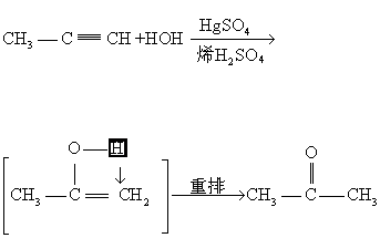 炔烃与水加成,先生成很不稳定的“烯醇式”化合物,即刻发生分子内重排,生成酮或乙醛 (乙炔水合产物为乙醛):