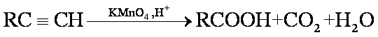 炔烃还可以与氢氰酸,酸,醇等加成。 叁键可以被高锰酸钾等氧化剂氧化,氧化时叁键断裂,若叁键在分子端点,氧化产物为二氧化碳,在其他情况下,氧化产物为羧酸:
