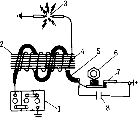 点火线圈示意图 1.蓄电池 2.铁芯 3.火花塞 4.高压线圈 5.低压线圈 6.凸轮 7.触点 8. 电容器 |