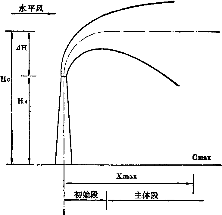 上图是烟气从烟囱排出后的运动状况。烟气从烟囱口排出后,由于自身的动力与热力作用,保持继续浮升的趋势,而水平方向的风将烟气流推向下风侧,故烟气流轴线逐渐向水平方向弯曲。烟气流的轴线尚未完全达到水平前的一段称为初始段。初始段以后是烟气流的主体段。主体段烟气流的水平轴线与排气口之间的高度差称为烟气流的抬升高度,以△H表示。△H与烟囱几何高度H