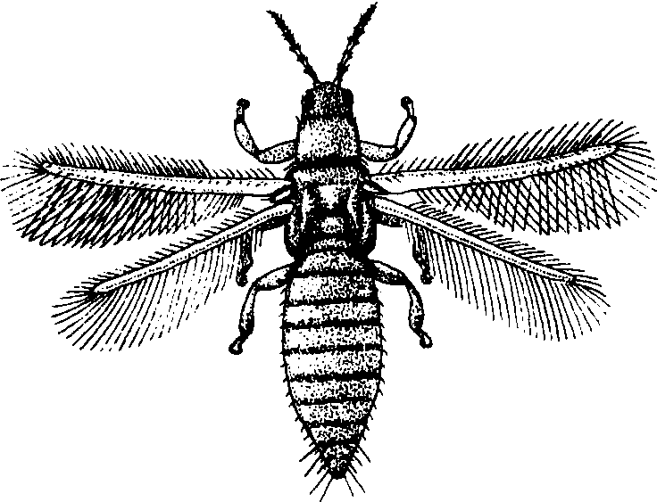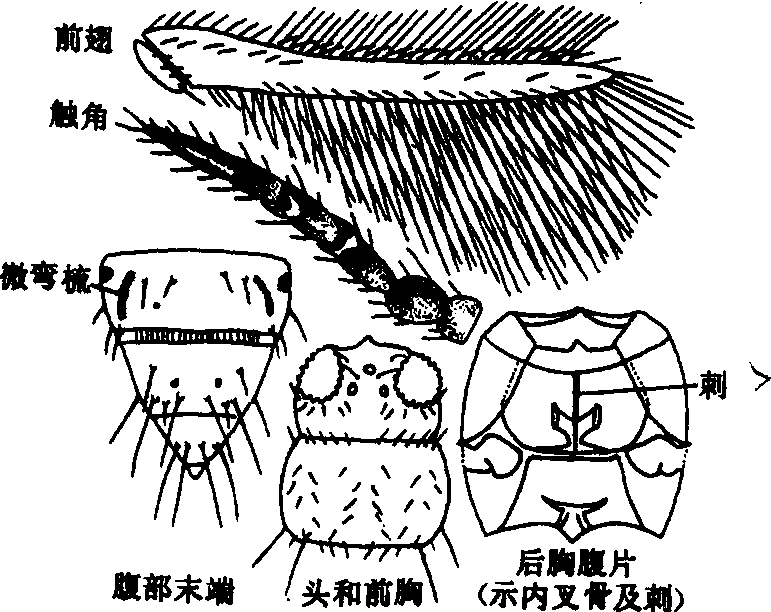 图2 烟蓟马特征图 中国东北年生3~4代,山东6~10代,长江流域以南10代以上。以成虫、幼虫和少数伪蛹在枯叶或土中越冬。每代历期19~23天,夏季最短仅15天。卵和幼虫期约5天,蛹期约3.7天,成虫寿命约6.2天。田间为害盛期,河南、山东、江苏等省多在5月中、下旬到6月上、中旬,新疆为6月下旬到7月上旬,黑龙江为6月中旬到7月中旬。成虫活跃,善飞,可借风力作远距离迁飞。成虫白天多在叶背为害,对蓝色光有强烈趋性。每雌产卵10~30粒,多产在叶背的叶肉或叶脉组织内。25℃左右、相对湿度60%以下时有利其发生,所以干旱年份的5月中下旬至7月上旬作物受害重,高温高湿对其发生不利,暴风雨可降低其发生量。为害葱蒜,成为大田作物的虫源基地。干旱年份进行灌水可减轻危害,严重发生时可用乐果、甲基对硫磷等防治。 烟蓟马onion thripsThrips tabaci Lindeman,又称棉蓟马、葱蓟马。昆虫纲,缨翅目,蓟马科。世界广布种,中国以北方地区较重。寄主植物有棉、烟、葱、蒜、瓜类等300余种。成虫体长约1.2 mm,黄褐色;锉吸式口器;触角7节,第3、4节上有叉状感觉锥。前后翅狭长,翅缘有缨毛,前翅具翅脉两条,上脉端鬃4~6根。腹部第2至第8节背面各有一栗色横纹。若虫形似成虫,淡黄色,触角6节,翅发育不完全。一年发生3~10代,多以成虫在枯枝落叶下、葱蒜叶鞘内侧和土缝内越冬。翌年棉苗出土时迁入棉田。成、若虫为害棉子叶、真叶和生长点,被害后叶片出现银灰色斑点,形成无头苗、多头棉,使结铃减少,成熟推迟。成虫善飞,卵产在叶背的叶肉或叶脉组织里。若虫共4龄,第3龄为前蛹,入土化蛹(即第四龄若虫)。可采用清除田间杂草、药剂拌种、棉花苗期喷药等方法防治。 |