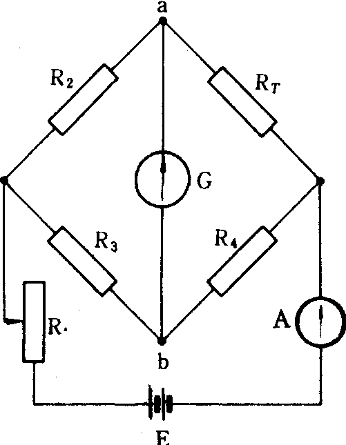 图 1 直热式热线风速表(不平衡电桥)原理示意图 固定电流法 固定加热电流,根据RT的变化情况决定风速大小。一般用不平衡电桥原理工作。线路同图1,G不作为平衡指示器而是用来指示风速。工作时保持电流不变, 由于风速影响,RT因温度降低而减小,电桥失去平衡, G中电流大小即可指示风速。这种方法同样存在气温变化和太阳辐射影响所形成的误差。可以用图2的线路较好地解决这个问题。图2中1、2、3、4是四根特性完全相同的铂丝,r1、r2、r3的电阻,γ1=γ2=2γ3。E2主要用作铂丝1、2加热的电源,铂丝1和2用于测风,3和4主要用来补偿气温的变化。工作时1、2、3、4全暴露在空气中。当v=0时, 电桥处于平衡状态,不论外界气温如何变化,都不能改变,对气温起到了补偿作用。风速改变后, G不会受太阳辐射和气温变化的影响。
