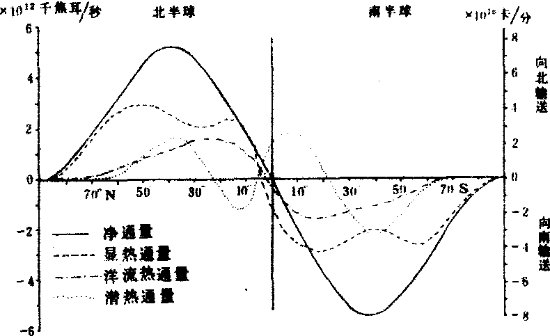 地—气系统中热量的水平输 送实线表示海—气系统中每年向北的平均净能量通量,其他曲线分别表示大气实在能量通量、大气潜热通量和海洋流热通量(根据Sellers.1965)。 海陆间的热量传输主要通过大气环流来完成。冬季,大陆是冷源,海洋是热源,盛行海洋气团的沿岸地区(欧洲西北部)有热量从海洋输向大陆,而且随距海岸距离的增加输送热量逐渐减少,到大陆另一侧温度达到最低。夏季,大陆是热源,海洋相对(同纬度)是冷源。如有气流从陆地吹向海洋,则有热量伴随输向海洋,引起海洋,特别是沿岸区温度升高。例如日本海附近气温比海温高1℃左右。 ☚ 地球热量平衡 大气温度 ☛ |
