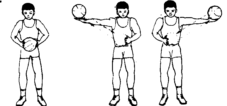 环绕腹背交接球 两脚左右开立, 右手持球于体侧绕经背后交左手,左手在腹前再交右手。如此顺、逆时针方向进行练习。 环绕单腿交接球 两腿斜前后站立,屈膝半蹲,上体稍前屈, 两手围绕前腿连续作交接球练习。