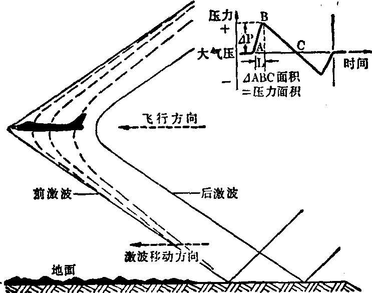 | 释义 | 爆声 爆声当飞机作超音速飞行时,在飞机四周形成的激波传至地面即可引起类似雷声的爆响,称“爆声”,或称“音爆”。超音速飞行时,由于飞机前缘的空气粒子来不及逆气流方向传播,从而形成一道压力、密度和温度都突然增高的空气层,在机头、机翼、尾翼等处形成激波。这些波在离开飞机一定距离后,汇合成前、后两道激波——头激波和尾激波。当激波以飞机飞行速度掠过地面航迹时,即可使地面大气压力发生呈N形分布的急剧变化:头激波引起压强陡升+△P,然后压强连续地下降,在尾激波前降到-△P,尾激波经过时恢复到大气压。这种瞬时压力变化(+△P或-△P),作用于人耳鼓膜,即可引起类似响雷或开炮声的声响感觉。飞机前、后激波的时间间隔约为0.12~0.22s,故地面上听到的爆声也是急速的接连两响。