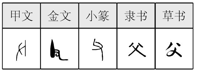 父 甲骨文; 金文; 篆fù[丶(石斧,意符)+又(手,意符)→父(《説文》:“父,巨也。家長率教者。從又舉杖。”不確。新石器時代磨制的石斧是主要的工具,甲骨文“父”像以手執斧的長者,新石器時代的“斧”尚無柄,借爲“父”。父,本爲族中長者。母系社會崩潰後,生父可以確定,於是“父”指生父,家族中或親戚中的長輩〈伯父、叔父、舅父、姑父〉。)] 《詩經·邶風·日月》:“父兮母兮!畜我不卒。”(爹啊娘啊,丈夫愛我不得長啊!) 《荀子·非相》:“夫禽獸有父子而無父子之親,有牝牡而無男女之别。” 《吴子·治兵》:“與之安,與之危,其衆可合而不可離,可用而不可疲,投之所往,天下莫當,名曰父子之兵。” 父(4画) ❶fù ❷fǔ
