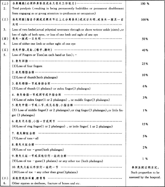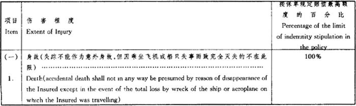 | 释义 | 人身意外伤害保险 【简介】: 人身意外伤害保险是一种只负责因意外事故而引起人身伤害的保险。投保人在保险有效期内,因意外伤害事故造成人身伤亡或残废时,保险人负责给付全部或部分保险金。人身意外伤害保险合同是投保人与保险人就人身意外伤害保险事宜所达成的具有民事权利、义务关系的协议,包括人身意外伤害保险条款(个人)、人身意外伤害投保单、人身意外伤害保险单。人身意外伤害保险条款共十三条,主要内容有保险对象、保险期限、保险金额、保险责任、除外责任、保险费率、保险手续和保位费的缴付、保险金的申请和给付。 【范例】: 赔偿金额表 INDEMNITY SCALE