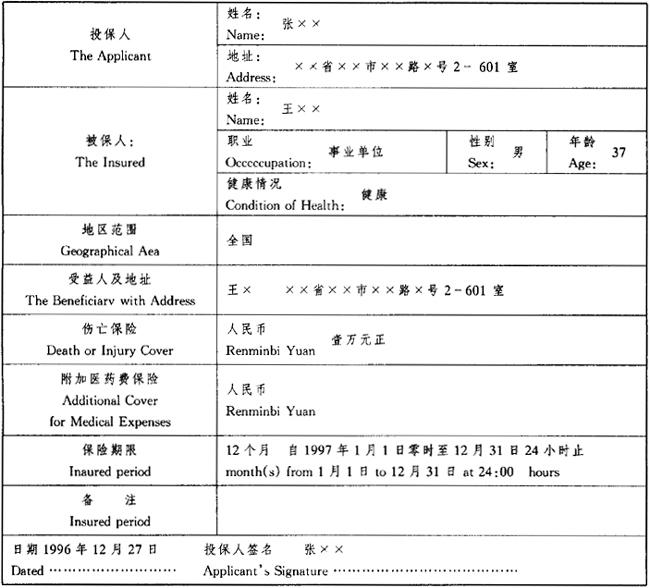 附约:本表内赔款按下列附约办理: 一、在保险有效期内,不论发生一次或多次赔偿,本公司赔偿累计以不超过保险金额为限。 二、被保险人不得因遭受一次意外,而获得表列一项以上的赔款金额。只表列第五项内的可同时兼得。 中国人民保险公司人身意外险投保单 The People’s Insurance Company of China PROPSAL FORM FOR PERSONAL ACCLDENT INSURANCE 兹拟向中国人民保险公司保险,内容如下: Insurance is required from the People’s Insurance Company of China on the undermentioned particulars:
