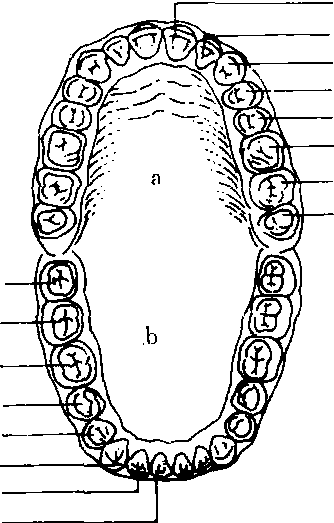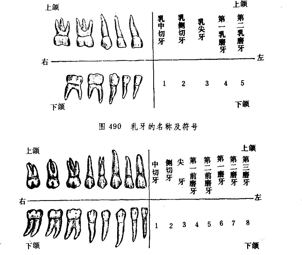 图491 恒牙的名称及符号 ☚ 口腔 龋齿 ☛ 牙齿 牙齿yachi人体内最硬的器官。位于上、下颌骨的牙槽内,除负担切咬、咀嚼等功能外,还起保护面部外形和辅助发音等作用。人的一生要萌出两次牙齿。第一次萌出的牙齿为乳牙。婴儿出生后6个月左右开始长牙,到2岁半左右长全,上下颌左右侧各5个,共20个。自6~7岁开始,乳牙先后自然脱落,并逐渐长出恒牙,到13~14岁乳牙全部换完。恒牙上下颌左右侧各8个,共32个。最后一颗牙叫智齿,智齿也有终生不出者。根据位置、功能和形状不同牙齿可分为切牙 (门牙)、尖牙 (虎牙)、双尖牙 (前磨牙)、磨牙(石牙) 四种,其排列顺序如下: 上下颌左侧的牙