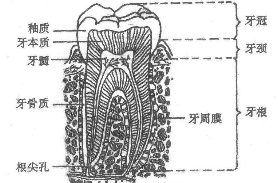 切牙、尖牙长得比较锐利,主要用来撕咬和切断食物;双尖牙、磨牙长得比较圆钝、坚实,有利于反复磨碎食物。每一牙都由牙冠、牙颈和牙根(见图)组成。牙冠是牙体显露于口腔及被牙龈覆盖的部分。牙根是牙体固定在牙槽窝内的部分,也是牙体的支持部分。牙冠与牙根交界处呈一弧形曲线,称为牙颈。构成牙的基本物质是牙质。在牙冠表面被覆有釉质,非常坚硬。牙根表面被覆有骨质,牙内部有牙髓腔,其中有由结缔组织、血管和神经组成的牙髓。牙的釉质虽坚固,但如不注意保护,也易被过硬食物损伤,或被食物残渣的发酵、腐败产物所腐蚀,引起牙的逐渐损坏,以至产生龋洞。露出牙髓腔的神经,引起剧痛。自2岁半至6岁正值儿童全身及面颌部发育的重要阶段,乳牙存在的时间虽较短,却是儿童主要咀嚼器官,对消化和营养吸收,刺激颌骨的正常发育,引导恒牙正常萌出,都有重要作用。