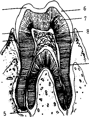 1. 17—21岁 9.中切牙2. 11—13岁 10.侧切牙3. 6—7岁 11.尖 牙4. 11—12岁 12.第一前磨牙5. 10—12岁 13.第二前磨牙6. 9—10岁 14.第一磨牙7. 7—8岁 15.第二磨牙8. 6—7岁 16.第三磨牙 a.上颌恒牙 b.下颌恒牙1—8,生长年龄 人恒牙结构及生长年龄 牙齿由牙冠、牙根和牙颈组成。露出牙龈以外的部分叫牙冠;嵌入牙槽的叫牙根;牙冠与牙根之间的叫牙颈,牙颈外被覆的粘膜叫牙龈。牙冠表面是一层釉质,是体内最硬的组织,其硬度近似石英。牙根表面包有一层牙骨质。牙本质是牙的主体结构,其内的腔隙叫牙髓腔,牙髓腔内充满了牙髓。牙根和牙槽骨之间有牙周膜,牙周膜、牙龈和牙槽骨合称为牙周组织,有支持、固定牙齿的作用,因此牙周组织患病时,牙齿会松动,甚至脱落。 牙齿具有咀嚼、发音、美观等作用。儿童正处于乳牙和恒牙的交替时期,注意口腔卫生,预防牙病发生非常重要。养成早晚刷牙,饭后漱口的习惯;多吃含钙和纤维丰富的食物;要充分利用不同的牙齿咬嚼食物;克服吐舌、吮指,口呼吸的习惯,否则易使牙列不齐或生龋齿。牙列不齐影响咀嚼功能和面容美观,同时易使细菌滋生,因此要及早进行矫正。龋齿(俗称虫牙)是由于牙釉质损伤或被腐蚀,细菌侵入牙本质造成。严重的可影响正常的学习、工作和睡眠。预防时可选用氟化物牙膏刷牙,而且要学会正确的刷牙方法。