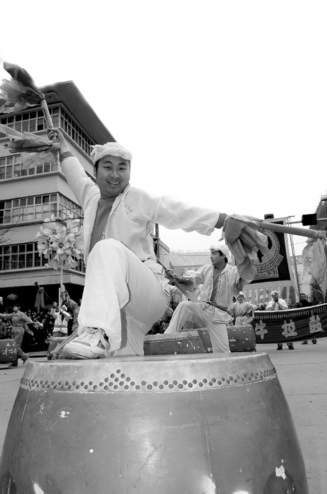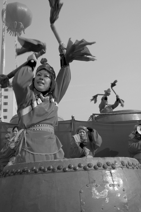 | 释义 | 牛拉鼓 牛拉鼓niulɑɡu传统民间社火。流行于咸阳城区东南坊一带,为典型的北方民间打击乐舞。因其鼓形硕大,需用牛拉车载而得名。鼓面直径一般都在1.3米以上,鼓身描龙画凤,纹饰古朴,以寓吉祥之意,鼓槌系彩绸,擂起来声震数里之外,鼓手舞姿雄健,气势豪放威武。该鼓是鼓乐与舞蹈的结合,由锣鼓队与梆绞舞队组合表演。锣鼓队由大鼓、小鼓、大锣、小锣、螺号和铙钹组成,铙钹少则几十副,多则二三百副。演奏时前有大锣、马锣、铙钹、京钗开道,中有指挥鼓(即牛拉大鼓,现用大鼓直径最大为185厘米),后有梆绞舞队,中间夹有海螺(俗称牛角号)。敲铙者不论男女,一律是虎豹头白肚子手巾,乐队前有五彩缤纷的彩旗仪队配衬。鼓师披红挂彩,有时一人一鼓,有时双人双敲,左右呼应,乐队多时数百人,行如长龙,静成方阵。众多表演者随鼓声的节奏,时而高举铙钹铜锣在头顶来回翻转,时而在胸前劲敲。鼓师边击边舞,时而猛虎扑食,时而张飞舞鞭、金鸡倒立。鼓师的动作有点击、轮击、滚击、单抛槌、双抛槌、背抛槌,还有童子拜佛、金鸡独立、回头望月、霸王背鞭等名目,今又新增金蛇狂舞、白鹤展翅等几十种舞姿。该鼓鼓谱繁多,多用什样锦或社火鼓,鼓头有三起三落、杀鼓头、单惊鸣和千鼓头四种,任鼓师选取一种作为开场,转入四环花样中的某一环,如单劈、单槌、单过桥、双铃,再进入主调。主调是千鼓番和四季花。千鼓番运用较多,也是全曲的高潮,其特点就是翻铙。四季花的特点是亮大锣,铙钹休息,起伏跌宕,轻重缓急,节奏鲜明,张弛有致。此鼓最早以小车推,后用牛车拉,现用拖拉机或卡车载。一般在盛大节日、庆祝活动时演奏。正月十五元宵节耍社火时要用高跷(柳木腿)开路。人数少则三四十人,多则数百人。现已遍及城乡,尤以秦都区渭滨镇东南坊锣鼓队和原利民村的“什样锦”最负盛名,曾为陕西省首届农民运动会、毛主席纪念堂送青松仪式等作过表演。在1989年国际旅游日和陕西省第二届艺术节开幕式上荣获特别奖,被誉为“华夏一绝”,入选中日合拍大型环幕电影《万里长城》和中国与加拿大合拍的《秦王出征》影片,著名鼓师有渭滨镇东南坊农民余凯等。