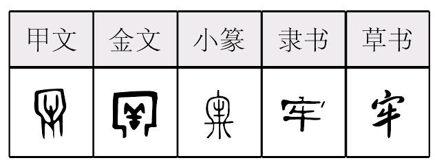 ❹ 画地为牢|亡羊补牢 牢牢,甲骨文作  ,金文作   ,小篆作 。 牲畜之圈,外爲欄,内爲牲,或从牛,或从羊,後世統一从牛。“牢” 的本義是飼養牛羊牲畜的圈欄,引申爲監獄、牢固等義。卜辭指圈養以供祭祀之用的牲畜,所以姚孝遂認爲,經過特殊圈養之後作爲祭牲的牛羊稱爲 “牢”“”。古代祭祀分太牢、少牢,也寫作大牢、小牢。通常的解釋是太牢用牛,少牢用羊、猪。裘錫圭説, 其初 “”或讀 “少牢”,後來成爲 “牢” 的異體。有趣的是,金文“太牢”的合文作 ,堪稱一絶,而類似的合文在卜辭裏多見,也稱得上是古人的一大創造。提示: 金文末字字形取自 《新見金文字編》,字形以一長横表示封閉圈欄。此字形發現很晚,但爲小篆和秦簡牘文字形的來源提供了唯一可靠的證據。不過這個字形後遭淘汰,分析原因,當是因爲原字的圈欄形不便書寫,所以戰國文字或依甲骨文第三字形改从宀,而从宀之字,即使兩側竪畫延長,其底部也不便加横封閉,故後世不用,可知文字生命的壽夭必有緣由。 楚簡帛文作 ,从宀从牛。秦簡牘文作 ,沿襲金文一體,與小篆同。 牢láo(7画)