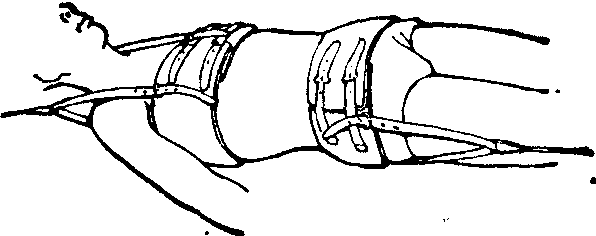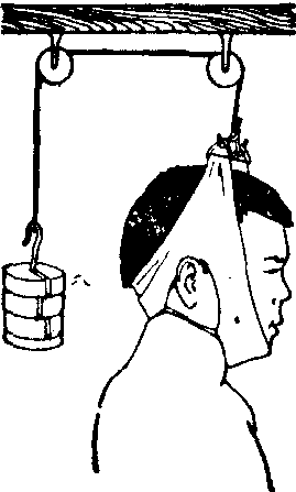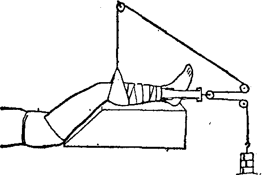 | 释义 | 牵引术traction利用牵引器械,牵拉胎儿的前置部,以解救难产的基本助产方法。适用于母畜轻度产道狭窄或胎儿稍大,阵缩及努责微弱,胎位轻度异常和某些姿势异常而同时胎儿又较小时。此外,胎儿异常姿势经矫正后,常用牵引术取出胎儿。 牵引术traction系骨科常用的一种治疗技术。方法有骨牵引、皮牵引及徒手牵引等。适应症:长骨骨折与骨折脱位后不稳定,需维持对位排列者;骨折脱位需持续牵引方能复位者;需矫正或预防因肌肉痉挛所致的关节畸形;软组织挛缩引起的畸形;某些腰、颈椎疾病等。牵引时必须注意引力的大小、方向,否则可致失败。 牵引术 牵引术牵引术是用牵引力和反牵引力对肢体或躯干进行牵引,使骨折移位,关节脱位得到复位和固定,或使关节挛缩畸形得到矫正。通过牵引装置,利用悬垂重量为牵引力,身体重量为反作用力者为持续牵引,其牵引重量以骨折缩短移位的大小和病人的体重而定。 图1 皮肤牵引 (1)布莱恩特牵引(Bryant's traction):病人仰卧,用皮肤牵引向上悬吊双下肢,以自身重量作牵引,臀部离开床面为度,牵引中应随时注意下肢的血循环。适用于二岁以内的小儿股骨骨折。可结合小夹板局部外固定。 (2)登禄普牵引(Dunlop's traction):这是一种上肢皮肤牵引,病人仰卧,上臂外展90°,屈肘45°,前臂在此角度上纵向牵引,上臂则用支架固定,或在上臂用宽带悬挂重量控制上臂抬起。适用于幼儿肱骨髁上骨折不宜于手法整复者。 (3)鲁塞尔牵引(Russell's traction):它是由悬垂重量通过三个定滑轮和一个动滑轮形成的合力组成的,故名之为合力滑动牵引,比单纯滑动牵引力大一倍。此牵引不需用布朗Br-aun架,只需用软枕垫托,病人感觉舒适(图2)。 ![]() 图2 Russell牵引 骨牵引 这是用钢针穿过骨胳进行的牵引,它能承受较大的牵引重量,一般股骨骨折用1/7体重,胫腓骨骨折1/10体重作牵引力,从而较迅速纠正骨折移位,关节脱位或关节挛缩畸形,尤适用于合并剧烈肿胀或皮肤有水疱的骨折,既能迅速消肿,又便于护理。在小夹板配合固定,保持骨折不移位的条件下,可以加强肢体功能锻炼,充分发挥运动与固定在骨折治疗中的作用,防止关节僵硬和肌肉萎缩,促进骨折愈合。牵引用具常用骨圆针、铁锤、手摇钻、各号牵引弓。 (1)股骨髁上牵引: 将患肢置于布朗架上,膝关节屈曲40°,自髌骨上缘引一横线,再由腓骨小头前缘向上述横线引一垂直线,二线之交点为穿针点,也可在内收肌结节之前方及上方各1.2cm。由内向外穿针,此牵引适用于短缩移位大的股骨干骨折,股骨转子间骨折和髋关节挛缩畸形。 (2)胫骨结节牵引: 在胫骨结节下2.5cm及胫前嵴后1.2cm处,从外向内穿针,此牵引适用于股骨干,股骨转子间及股骨颈骨折,但需用大重量牵引时,不宜用此法,以免牵松膝关节,宜用股骨髁上牵引。 (3)跟骨牵引: 穿针时在小腿后方垫一沙袋,使足跟抬高。从内踝下端至足跟后下缘联线的中点为穿针点,从内向外穿针。此牵引适用于不稳定型胫腓骨骨折和膝关节屈曲挛缩畸形。 (4)尺骨鹰嘴牵引: 从尺骨鹰嘴尖端向远侧一横指处再向内侧1.5cm处为穿针部位。为了避免损伤尺神经,主张在鹰嘴背侧上一螺丝钉到对侧骨皮质作牵引,此牵引适用于严重肿胀或有水疱的肱骨髁上骨折及肱骨髁间骨折。 (5) 颅骨牵引: 用颅骨牵引器,如Crutchfield牵引钳安装在颅骨上进行的一种骨牵引,适用于颈椎骨折和脱位。 牵引方式 根据牵引力的安置和使用的支架有下列几种牵引: (1)滑动牵引: 通过滑轮的悬垂重量为牵引力,抬高床尾使身体重量作为反牵引力,对骨折端产生持续的牵引作用。牵引力的方向应和近侧骨折段所指的方向一致,否则将造成成角畸形。滑动牵引分单纯滑动牵引和合力滑动牵引(鲁塞尔牵引)。 (2) 固定牵引: 将托马斯架上端铁圈抵着坐骨结节,将骨或皮肤牵引固定于支架的下端,上下端的力量和方向呈拮抗作用。支架下端固定在抬高的床尾上。这种牵引适用于股骨骨折复位后保持对位对线,而不能获得牵引复位的作用。 (3)托马斯牵引(Thomas’s traction):在骨科中是治疗损伤或疾病常用的方法,最多用在治疗股骨干骨折,采用一无屈膝装置的托马斯架(参见图3)和两条长胶布,后者下端各连一条带子,胶布作好皮肤牵引后,下端的两条带子彼此相反地绕过支架的直杆,牵紧并结扎在横的弧形杆上,此法是以坐骨结节为反牵引力的支点,常需随时将带子收紧结扎。后来改用牵引板、滑车和重量,作持续牵引,省去随时收紧带子的不便。 ![]() 图3 平衡牵引 (4)平衡牵引: 多用于股骨干骨折,采用胫骨上端骨牵引,或用固定牵引(见前),再将托马斯架通过滑车及重量悬吊于巴尔干架上,使整个托马斯架能随病人及伤肢自由起落,便于护理而不影响骨折的位置(图3)。 (5)布朗牵引(Braun’s traction):伤肢穿针后置于布朗牵引架上进行牵引(图4)。适用于股骨干; 股骨转子间; 股骨颈和胫腓骨骨折。 (6)垫枕牵引:伤肢穿针或贴胶布后不用托马斯或布朗支架,而垫枕进行牵引。此法简便、适舒。适用于股骨和胫腓骨骨折。 ![]() 图4 Braun牵引 (7)枕颌牵引: 用Glisson吊带前方托住下颌,后方托住枕骨结节部进行牵引(图5)。可采取坐位或卧位牵引。适用于颈椎骨折脱位,颈椎病或痉挛性斜颈。 (8)骨盆悬带牵引: 病人仰卧,用骨盆悬带将骨盆向上牵引,使之稍离床面。适用于有移位的骨盆环骨折。 ![]() 图5 枕颌牵引 ![]() 图6 