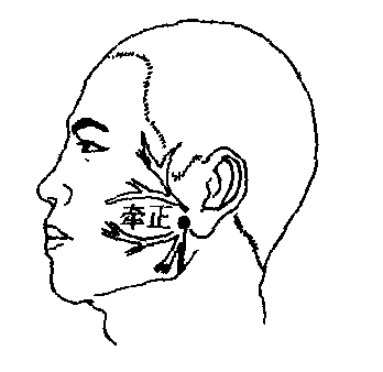 | 释义 | 牵正经外奇穴名。位于耳垂前0.5~1寸。在咬肌中。正当面神经颊支,上前方有腮管; 深部有咬肌动、静脉分支。主治面神经麻痹,腮腺炎,口腔溃疡等。斜刺或沿皮刺0.5~1寸 (图100)。