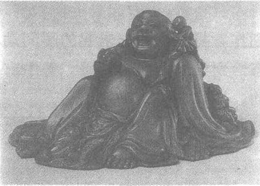 | 释义 | 犀角雕童子闹弥勒像 犀角雕童子闹弥勒像清雍正至乾隆(公元1723—1795年)。高7.9厘米,底径长15.3厘米,宽10厘米。香港收藏家叶义先生捐赠。北京故宫博物院藏。弥勒呈巍坐式,左手拄地、双膝屈曲,夹着袒露着的、硕大的肚子。其前后左右,围着几个嬉闹的儿童,一个顽皮的,骑在他的肩上,双手用劲拉他的耳朵,弥勒好像被拉痒了一般,缩脖耸肩,张嘴呵呵大笑,状极慈祥可亲。