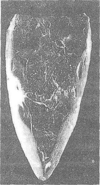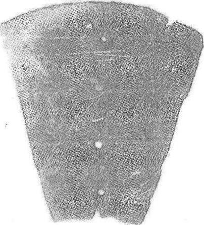图2 江苏吴县出土石犁 的铁犁铧冠出土,犁耕已在中原地区广泛使用。但出土的多数是V字型铧冠,宽度在20厘米以上,比商代铜犁大得多(见图3)。它是套在犁铧前头使用,以便磨损后及时更换,减少损失。这说明战国的耕犁已比商周时期进步得多,从而大大提高了耕地能力。但这一时期耕犁的结构仍不清楚。