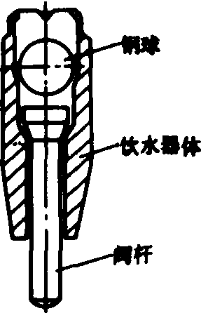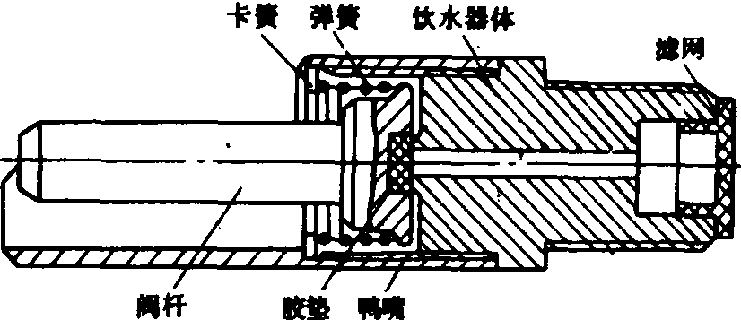 图2 乳头式 饮水器 鸭嘴式饮水器 有仔猪用和成猪用两种型式。它与地面呈60°倾角,用弯头与自来水管相接。安装高度随猪只生长期而变化,通常仔猪为25~30厘米,幼猪为50~60厘米,成猪为75~85厘米,饮水器由饮水器体、阀杆、胶垫、加压弹簧等组成(图3)。平时,阀杆在加压弹簧作用下,端部的胶垫将饮水器体上的出水孔封闭。猪只饮水时,咬动阀杆,使阀杆偏斜,水通过胶垫缝隙沿鸭嘴尖端流入猪的口腔,饮完水,加压弹簧又使阀杆和胶垫恢复正常位置,重新封闭出水孔,停止供水。鸭嘴式饮水器工作可靠,饮水时猪只是将饮水器衔入口内,从而减少水的浪费,适用于各类猪舍。