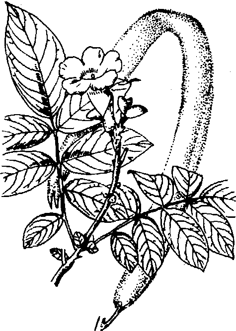 | 释义 | 猫尾木cattail dolichandroneDolichan-drone cauda-felina,紫葳科猫尾木属常绿乔木。株高达15m。树皮灰黄色,薄片状剥落。奇数羽状复叶对生;小叶7~13,矩圆形至卵形, 长5~20cm,全缘或中上部有细齿。顶生总状花序,花冠漏斗状,径10~12cm, 基部暗紫色,上部黄色,秋、冬季开花。蒴果下 垂, 长 30~60cm,密被灰黄色绒毛,状如猫尾;翌年8~9月果熟。产中国海南、广西及云南。喜阳光充足,土壤肥沃。播种繁殖。花大美丽,果形奇特,饶有异趣,为华南优良园林观赏树种,可作园景树、庭荫树或行道树。