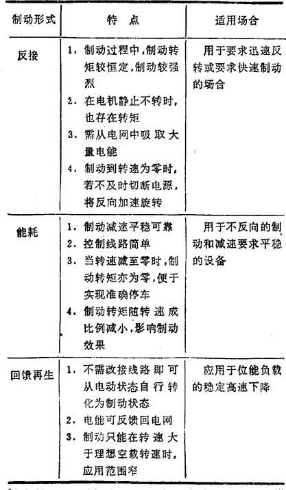 | 释义 | 他(并)励直流电动机的起动、制动和调速 2.3.1 他(并)励电动机的起动 直流电动机起动时需考虑的因素很多,如起动转矩、起动电流、起动时间、起动加速度、起动过程的能量损耗等。但其中最主要的是起动电流IQ与起动转矩MQ。 若将他(并)励电动机电枢绕组直接接电源电压起动,E=U-IRa。在起动瞬间,电枢由于惯性,n=0,反电动势E=0,此时起动电流为 ❷ 能耗制动,其原理如图8.2-26所示。 a)电动机状态 b)能耗制动状态 制动时断开电动机电枢绕组原电源,保持励磁电流不变情况下,将电枢绕组接一制动电阻,形成回路。此时电动机由于惯性旋转而成为发电机状态,旋转的动能变为电能,消耗在制动电阻上。 ❸ 回馈再生制动。工作于位能负载稳定高速下降,如吊车重物下降或电车下坡时,电动机的实际转速可能超过理想空载转速,此时电枢电流将改变方向,电动机成为发电机状态,其电磁转矩便起制动作用。 以上三种制动方式的特点与应用见表8.2-20。 表8.2-20 直流电动机的几种制动方式特点与适用场合