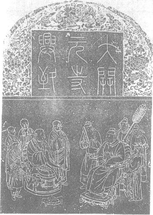| 释义 | 玄宗问法石刻线画 玄宗问法石刻线画元延祐六年(公元1319年)。全长163厘米,宽55厘米。陕西省博物馆藏。此图是“大开元寺兴致碑”中部的石刻线画。图的左右各有五人。右部以唐玄宗为主,他坐于高大的扶手椅上,左肘拄椅,足蹬踏床,前倾身,向对面的腾光法师发问着什么。四个侍者或手执笏板,或高举羽扇,或捧杯恭立其身旁、身后。左部以腾光法师为主,他正袖手结跏趺坐于圆台上,全神贯注的盯着玄宗,倾听他提出的问题。四个小和尚袖手立于其后,或东张西望、或侧目斜视,颇为悠闲。碑下刻有此图的内容和题识、刻字者的姓名。这幅线刻画,构图匀称,人物形象生动,性格鲜明,具有较高的水平。