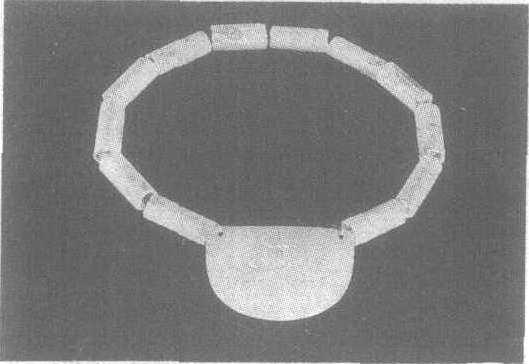 | 释义 | 玉串饰 玉串饰铜石并用时代良渚文化。浙江省杭州市反山出土。浙江省文物考古研究所藏。此件串饰由12个玉管和一块玉饰组成。玉管长短略有差别,玉质为白色,上带茶色斑点。玉饰类似半圆形,正中以极细的刀工刻出简化的神人兽面纹,它代表着良渚文化的神徽。此件玉串简洁明朗,图案精美,刀工绝伦。良渚文化见“方柱形玉尖状器”条目。