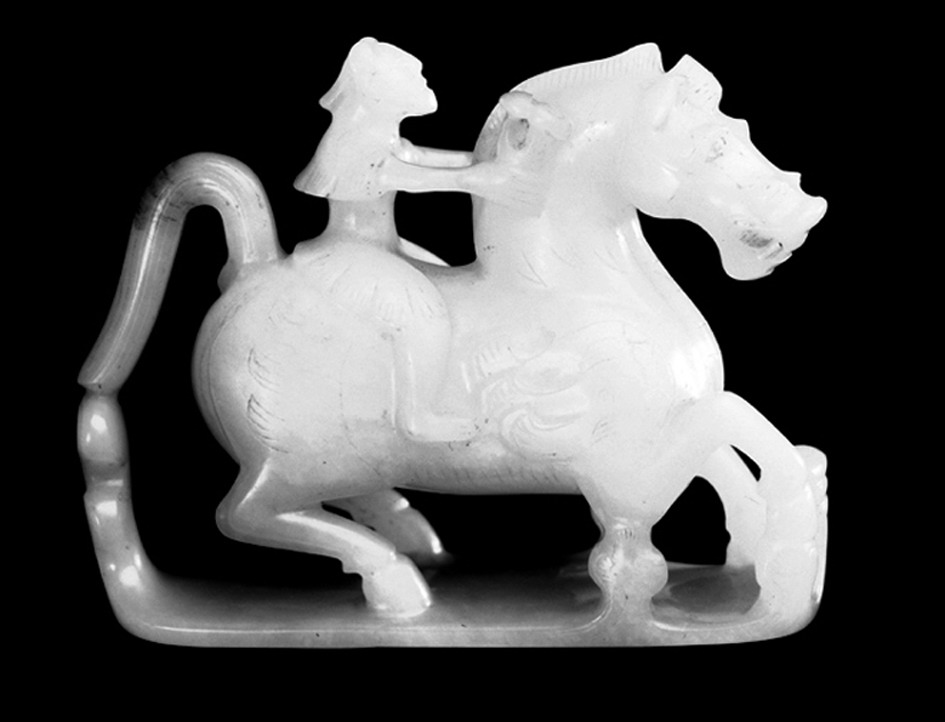 古代名物 > 雕繪類 > 雕塑部 > 工藝雕塑 > 玉仙人奔馬 玉仙人奔馬 yùxiānrénbēnmǎ 西漢玉石雕刻。公元1966年陝西省咸陽市漢昭帝平陵遺址出土。圓雕。高七厘米,長八·九厘米。玉料呈白色。奔馬昂首挺胸,張口露齒作嘶鳴狀。雙目前視,兩耳竪立。四肢彎曲,右前蹄蹬空,脚踏雲板,身飾羽翼,作飛騰狀。馬背上騎一仙人,頭繫方巾,身着短衣,威武異常。玉馬肢體肥碩,雕琢精美,表現了西漢玉雕工藝之卓越水平。是迄今所知之絕世佳品。現藏陝西省咸陽市博物館。 玉仙人奔马 玉仙人奔马西汉早期。高7厘米,长8.9厘米。1966年陕西省咸阳市汉昭平陵遗址出土。陕西省咸阳市博物馆藏。玉料为白色,质地坚硬,温润细腻,圆雕而成。马勾首嘶呜,双耳如锥,鬃毛齐整,身躯极为健壮僄悍,并阴刻翅膀。四肢弯曲。与踏板相连,右前蹄翅起,作奔腾飞跃状。马背上骑一人,头束巾,穿短衣,双腿夹紧马肚,两臂前伸触及马颈,神气活现。此玉雕琢细腻,骏马骨肉停匀,其内在的气质也刻划了出来,是汉代玉雕精品。有人从此马的神态判断,玉雕表现的是“天马”。《汉书·张骞传》:“‘神马当从西北来’。得乌孙马好,名曰 ‘天马’。”古代诗人对西域来的骏马(即天马)也曾有极为生动细致的歌咏。