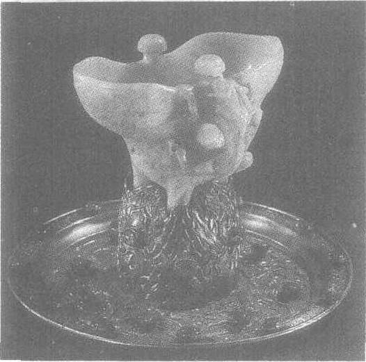 明万历。通高14.5厘米,金托盘高1.5厘米,直径19.7厘米。重499.5克。1956年北京市定陵万历皇帝墓出土。北京市定陵博物馆藏。青色玉料上有黄褐色浸痕。杯体上宽下收,呈不规则状,形制似商周青铜爵,为一种酒器。口沿两柱短粗,流宽大,鋬镂雕成龙形,姿态生动。底有三足,周身刻仿古纹饰。玉爵配一金盘,中央凸起一山形,爵置于其上。山下有凸雕的金龙,其间镶有各种宝石。玉爵古朴犹存,金盘富丽堂皇,两者相配产生奇异效果,是这批随葬玉器中的精品。