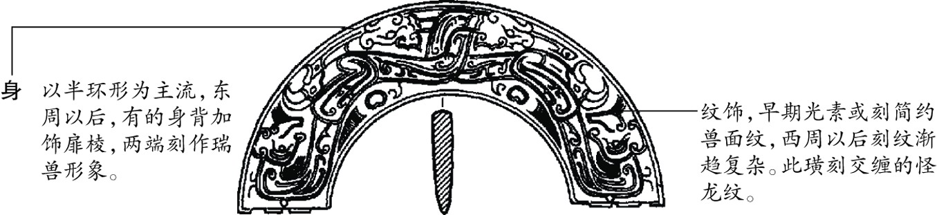 玉璜(西周晚期。山西侯马北赵晋侯墓63号墓出土。) 玉璜 玉璜先秦玉器。1973年在陕西凤翔县石家营乡豆腐村姚家岗一先秦宫殿遗址中发现。共十一件。纹饰多为回纹,两端钻孔。长4~4.8厘米,宽0.9~1.7厘米, 厚0.3~0.4厘米。 ☚ 高家堡周墓玉器 素面玉玦 ☛ 玉璜扁平弧形玉器。弧度与1/2或1/3个璧、环相当。楚玉璜主要有两种形制:(1)弧形,两端齐平;(2)兽首形,两端琢成兽首或龙首。器身或素面,或有涡纹、云纹、谷纹。璜形仿自然之虹。为佩饰与礼仪用器。《周礼·春官·大宗伯》:“以玄璜礼北方。”北方五行属水,虹之形成亦与水汽有关。 |