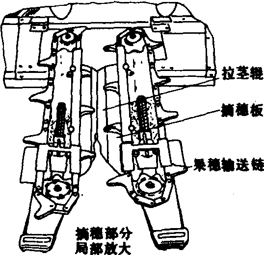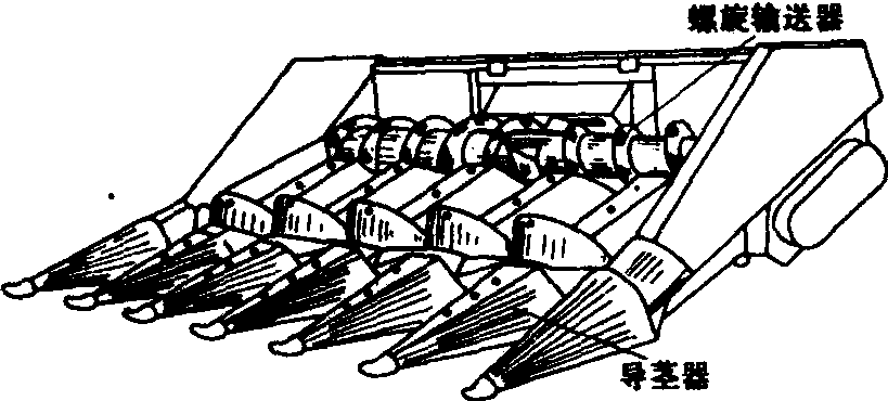 玉米摘穗台 玉米摘穗台的主要工作部件是:❶拉茎辊。它有锥形六叶辊、锥形四叶辊、菱形四叶辊等几种形式,辊直径76~100毫米,长度约500毫米,线速度4~6米/秒。拉茎辊有悬臂式和支承式两种。悬臂式可避免前支承座与茎叶和杂草的缠绕,有利于导入茎秆。拉茎辊的传动有开式和闭式两种。开式传动由固装在驱动轴上的几组齿轮传动副组成,结构较简单,但不能调整传动位置。闭式传动由几组可在驱动轴上滑移的整体封闭齿轮箱组成,可根据行距调节传动位置。 ❷摘穗板。根据两摘穗板间的间隙可调与否,分为固定的和可调的两种。摘穗板进口间隙22~35毫米,出口间隙28~40毫米。大间隙用于收获粗大、潮湿玉米,小间隙用于收获小果穗细茎秆玉米,进口间隙要小于出口间隙,以防卡塞。 ❸果穗输送链。由两条带拨齿的套筒滚子链组成,拨齿在两条输送链上的排列有相对和错开两种形式。输送链的线速度为1~1.8米/秒, 为适应不同产量的要求, 宜采用无级变速。 谷物联合收割机配玉米摘穗台可扩大其使用范围, 提高机器的利用率。但收获的玉米品种成熟度需基本一致, 收获时籽粒含水率应在32%以下。同时需拥有充足的烘干设备, 使收获后的玉米籽粒能及时烘干至含水率15%以下, 否则不宜采用。 玉米摘穗台corn snapping header自走式谷物联合收割机配备的专用玉米摘穗收割台。摘穗割台的类型较多,大量采用的是摘穗板式摘穗台,它的关键部件是拉茎辊和摘穗板。当茎秆被导入拉茎辊后,在交错配置的拉茎辊的作用下沿拉茎辊的切向运动,当果穗到达摘穗板间隙时,其大端被卡住,在茎秆被拉引时将果穗摘下。摘穗台能较方便地挂接到联合收割机上,可一次收割6~8行玉米,经济效益较高,是当前联合收割机的一种发展趋势。