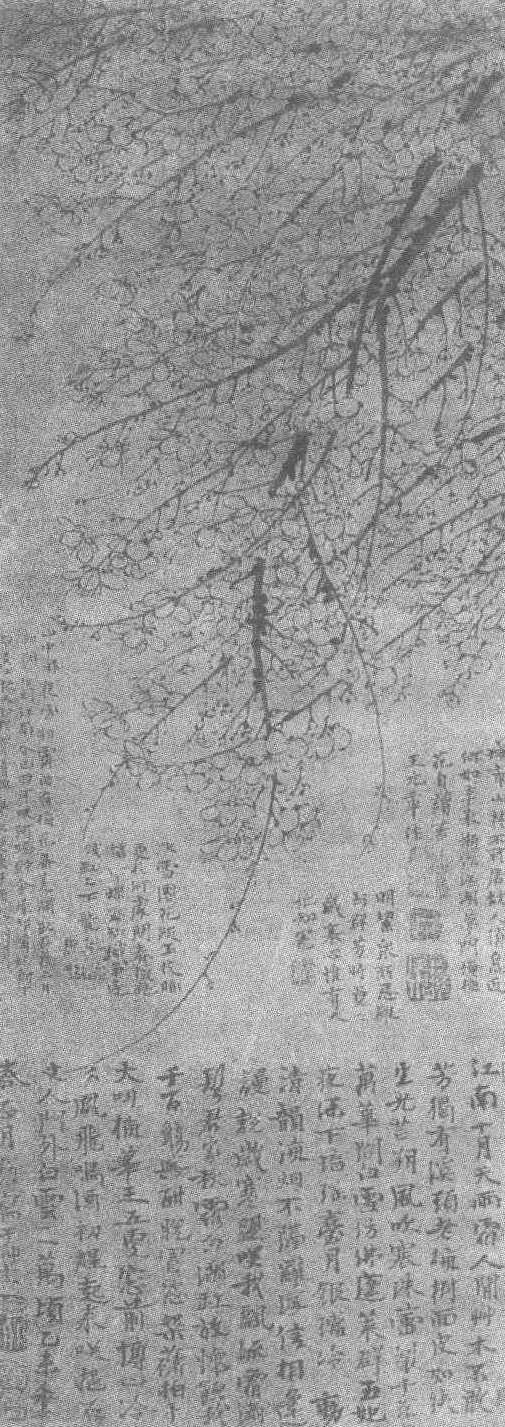 元。王冕(见《王冕墨梅图卷》条目)绘。纸本墨笔。纵68厘米,横26厘米。上海博物馆藏。此图描绘一簇倒垂的春梅,枝条茂密,纤长细劲,梅梢微微曲转,仿佛沐浴在和煦的春风之中、主次分明,前后交叠,富有韵律感和节奏感。枝头裹满了繁密的花朵,有的蓓蕾含苞,有的展瓣怒放,明洁圆润,犹如大大小小的珠玉,正侧俯昂,千姿百态,虚实相托,密中有疏。画幅中飘逸着温馨的清香。梅枝下方有作者题诗五首。此图梅枝以润墨挥写,梅朵用细笔勾圈,再以焦墨点苔、描蕊,笔法精妙,墨色鲜明。花鸟画自北宋以来,其构图就十分注意画面的均衡、协调,疏密结合以及情节上的相互呼应,但其表现形式却往往因循守旧,少有创新,而王冕则不然,他的作品在设景布势上颇为大胆,他画墨梅,师法北宋扬无咎,但宋人作梅多疏枝浅卉,此图则以密花繁枝见胜,且风格劲健、洒脱、热烈、流动,毫无雍滞之感。显示出画家深厚的艺术修养和娴熟的笔墨技巧。图中款署:“乙未年春正月朔写于草堂。”乙未为至正十五年(公元1355年),王冕时年68岁,正处于艺术颠峰时期。此图深为后人珍视,诗塘及裱边四周,相继有明人祝允明、陆深、谢承举、文徵明、薛章宪、王宠、徐霖、王韦、唐寅、陈沂等人题诗。曾由近人庞元济收藏。