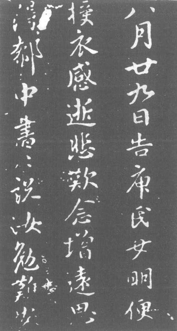王凝之·庾氏女帖 (局部) (東 晉·? —— 隆安三年 ?~399)山陰人。字叔平。羲之次子。歷江州刺史,拜左將軍,遷會稽内史。孫恩攻會稽,寮佐請為之備,拒從遭殺。凝之承家學,善草隸。其傅稱作〈庾氏女帖〉為行草書“八月廿九日告庾氏女明便授衣”云云七行,前半為行書,亦近楷;後半為草書。黄庭堅云“凝之字法最密,恨不多見。”妻名謝道蕴。 |