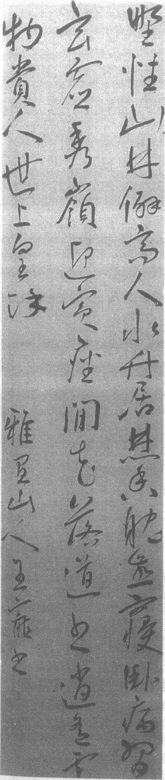 明。纸本。纵144.1厘米,横33.5厘米。北京故宫博物院藏。王宠(明弘治七年—明嘉靖十二年,即公元1494—1533年),字履仁,后字履吉,号雅宜山人,吴县(江苏苏州)人。以诸生贡太学。曾师蔡羽。擅长真、行、草书,文徵明后推第一。王世贞《艺苑巵言》评:“宠正书始摹虞永兴、智永,行书法大令,晚节稍稍出己意。以拙取巧,合而成雅,婉丽遒逸,奕奕动人,为时所趣,几夺京兆价。”何良俊亦赞其书:“衡山之后,书法当以雅宜为第一。盖其书本于大令,兼之人品高旷,故神韵超逸,迥出诸人上。”此件草书作品疏朗朴拙,有晋人遗意,为王宠草书佳作。