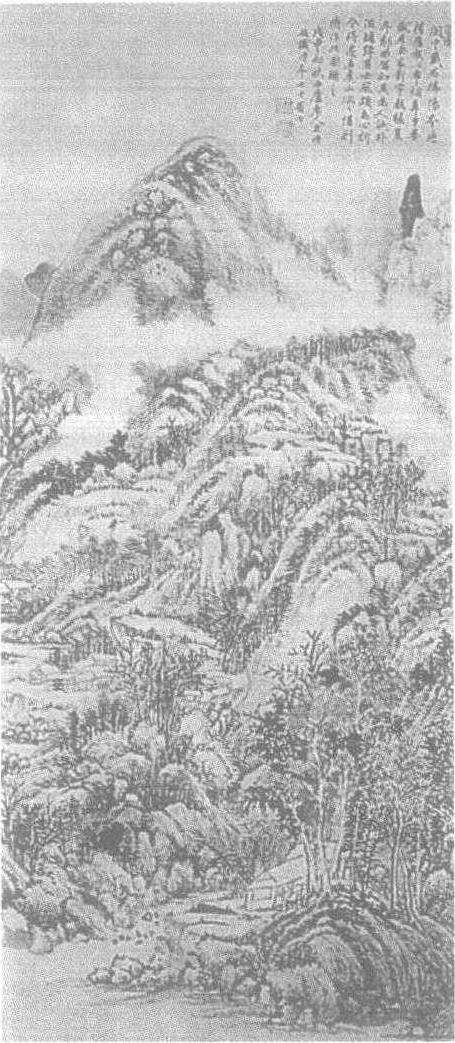 纸本,墨笔。纵134厘米,横60.2厘米。现藏北京故宫博物院。这是一幅全景式山水,墨色的浓淡虚实处理,颇具匠心。远近树木的描写亦颇为精致,淡墨点簇,细笔勾勒,毫无含糊处。画面自题: “闽中戴君瑞阳,本诗礼旧族,以市烟草至娄,僦居余家,对宇数椽,累年邻曲,习知其为人诚朴温醇,绰有士风,颇为心折。今将迁居虞山,依依惜别,特作此图赠之。戊申(康熙七年,即1668年)初秋西庐老人王时敏识时年七十有七 ”。