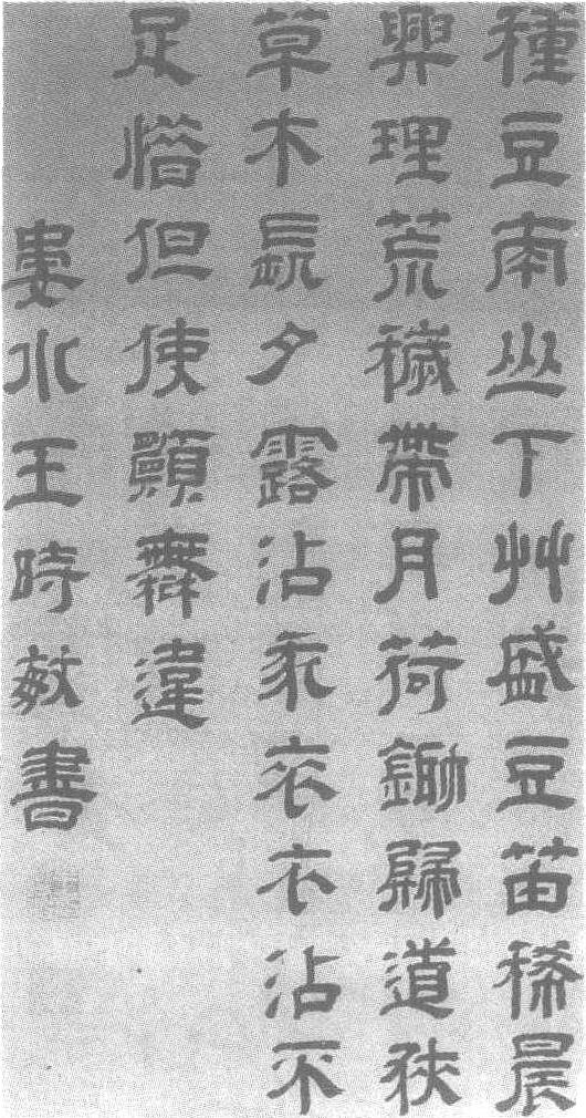 清。纸本。纵111.4厘米,横59.5厘米。北京故宫博物院藏。王时敏(明万历二十年—清康熙十九年,即公元1592—1680年),字逊之,号烟客、西卢老人。江苏太仓人。万历年间进士。官至太常寺少卿。入清不仕,归隐田园。工诗文。绘画成就极高,为“四王”之一。善书。《桐阴论画》评“行楷摹《枯树赋》,隶书追秦汉,榜书八分,为近代第一。”此件作品书陶渊明《归田园居》其三:“种豆南山下,草盛豆苗稀。晨兴理荒秽,带月荷锄归。道狭草木长,夕露沾我衣。衣沾不足惜,但使愿无违。”书体端整朴茂,用笔扁平,有唐隶意味。款署:“娄水王时敏书”。钤〈王时敏印〉〈西卢老人〉均白方。