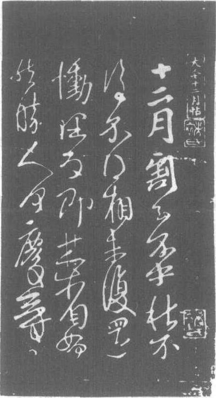 | 释义 | 王献之十二月帖 王献之十二月帖为王献之草书的代表作。该帖由开始行楷书渐变为行草书,字多联属,笔势奔放,可见王献之善一笔书之长。帖中写的内容为:“十二月割至不中秋不复不得相未复还恸理反即甚如何然胜人何庆等大军。”原墨迹曾为宋代米芾所收藏,此帖宋代曹之格刻入《宝晋斋法帖》第一卷中。对唐代草书家张旭、怀素等人影响深远。