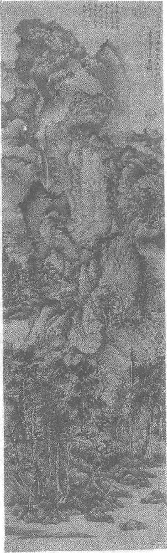 | 释义 | 王蒙青卞隐居图轴 王蒙青卞隐居图轴元。王蒙绘。纸本墨笔。纵140.6厘米,横42.2厘米。上海博物馆藏。王蒙(公元1308—1385年),字叔明,号香光居士。元末曾作“理问”小吏,嗣弃官隐居黄鹤山(今杭州东北郊临平山),故并已号黄鹤山樵。他在山中近30年,芒鞋竹杖,过着卧青山望白云的消闲生活,同时画家对山水的真实体貌也有了深刻的认识。这个时期,他间或下山,往还松江、苏州、无锡等地,并与倪瓒、黄公望、吴镇、陶宗仪、杨维桢、赵廷采等文人画士多有交往,相互切磋画艺,联合创作。明初,王蒙下山出仕,任山东泰安知州,后因胡惟庸案牵累,深隐图圄,死在狱中。王蒙是元末明初的山水大家,他是赵孟頫的外孙,初受外祖父的影响,钻研前代诸大家的绘画。清代王原祁评说:“山樵少时,酷似赵吴兴(孟頫),祖述辋川(王维),晚入董、巨之室,化出本宗体例,纵横离奇,莫可端倪。”由于他能广征博采,视野开阔,故能出前人窠臼,创造出一种密体山水。所画多千岩万壑,林泉幽深,构图缜密,但实中有虚,层次分明,不觉壅塞。喜用解索皴及渴笔干皴,山头破点,密而不乱,风格郁然深秀,又得苍茫之致。王蒙也能作墨竹、墨梅及人物画,具有多方面的绘画才能。王蒙在山水画发展史上有着举足轻重的地位,对明清两代的画坛产生了巨大的影响。后人将他与倪瓒、黄公望、吴镇并称为“元四家”。此图是王蒙画风的代表作。采用高远与深远相结合的构图形式。描绘了作者家乡吴兴西北的卞山景色。画面中峰崖耸峙,峦岭盘桓,千岩竞秀,万壑幽深。山势高低错落,起伏交叠,如激荡腾涌的海浪江波,浑莽苍劲,雄奇险绝。山间雾色轻渺,光影弥合,草木葱茏,涧谷空茫。飞瀑悬空高挂,清泉淙淙流淌。山脚溪水萦绕,平静和缓。岸边杂生各种树木,枝叶丰茂,参差错落。在荫翳之下一条小径曲转延伸,隐约有人曳杖前行。山林深处草庐数盈,堂内一人抱膝倚床而坐。画面构图繁复充盈,意境深邃幽清。笔墨技法融合了董源、巨然、郭熙、赵孟頫等前代画家之长,先以淡墨勾勒山石轮廓,由淡而浓,层次逐步加深。然后用披麻、解索、牛毛、卷云等多种笔法交互皴染山体,缜密灵活,变化无穷。双钩树干,重墨点叶,叶形多样,树种不同。山脉峰顶,苔点尤多,浑点、破竹点、胡椒点、破墨点等,表现了江南山岭苍润浑厚的特点。图中自题:“至正廿六年四月,黄鹤山人王叔明画青卞隐居图。”至正二十六年为公元1366年,王蒙时年58岁,正值艺术的成熟期,明人董其昌在诗塘题为“天下第一王叔明”。此图曾由元人赵麟、明人华夏、项元汴、董其昌、清人梁清标、安岐、李宗翰及乾隆内府收藏。《珊瑚网》、《平生壮观》、《式古堂书画汇考》、《大观录》、《佩文斋书画谱》、《墨缘汇观》著录。
