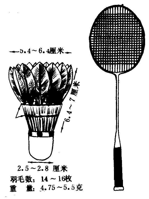 | 释义 | 球和球拍 球和球拍羽毛球是用14~16根羽毛插在半球形的软木托上制成。软木托直径为25~28毫米,托外包有白色薄皮革或类似材料。托面至羽毛尖长64~70毫米,羽毛上端围成圆形,直径为58~68毫米。在托上1.25和2厘米处用线将羽毛编结牢固。球重量为4.74~5.50克。羽毛球拍是用木、铝合金或碳素纤维等材料制成,质轻而坚实,并富有弹性。拍框中间用羊肠线或尼龙线经纬相错编织成拍面。球拍重量为90~120克(不包括线的重量)。球拍框为椭圆形,长为25~25.5厘米,宽为20~20.5厘米。球拍的握柄长为39.5~40厘米。手握处的直径最多不得超过2.8厘米。(见图2—3—24)