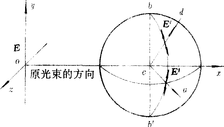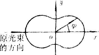 ❷如果入射光是偏振光,E在oy轴方向上振动,如图1。于是散射中心c的电振动也将平行于oy轴,它所发的次级球面子波中,电矢量E′都应是E的投影方向,E′又应垂直于子波传播方向,故散光也是偏振光,在不同方向上强度不同,在xoz平面内之各方面上最大,在偶极子轴bb′方向上为零。在yoz平面内,散射光强的分布随θ角而变.如图2。