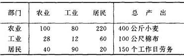 | 释义 | 价值型投入产出表 投入产出表可以用实物单位制表,但在实际应用中常用按币值制作的所谓价值型投入产出表。 现以高度简化的三部门经济为例: 如果小麦每公斤1元,棉布每公尺5元,每个工作日的工资4元,实物型投入产出表: