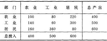 价值型投入产出表还可以看做是国民收入账目。例如,表中的600就是年度国民收入值,它即等于第三行所示的居民得到的收益的总数,又等于第三列所示的居民消费的商品和直接劳务的价值的总和。如果考虑投资,应当作为将来的消费从居民的一列中分摊出来。 |