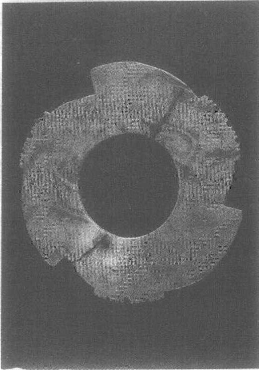 铜石并用时代龙山文化。直径8厘米。1978年山东省滕县里庄出土。山东省滕县博物馆藏。此器出土时断成两块,现已粘合复原。其形制奇特。似一变形环。周边有三个向同一方向旋转的凸棱,每一凸棱间各有一组小锯齿样的凸起。每组凸起有12枚,每三枚又分为一小组。这种器物以前多定为商或西周,近年在山东、河南、陕西等地的龙山文化遗址中皆有发现,从而使它的断代提前到新石器时代。其形状不尽相同,有三、四、五数量不等的凸棱,有的带小齿,有的则不带。吴大澂《古玉图考》称它为“璿玑”,认为是天文仪上的一个零件,后代学者多从其说。但夏鼐先生经考证后否定了此说。此物的真正用途目前尚无法确定,名称也只是暂定。有些旧藏物已流于海外,台湾也藏有此物。因上面有戚齿,台湾的文物工作者将它称为“戚璧”。龙山文化见“黑陶鼎”条目。