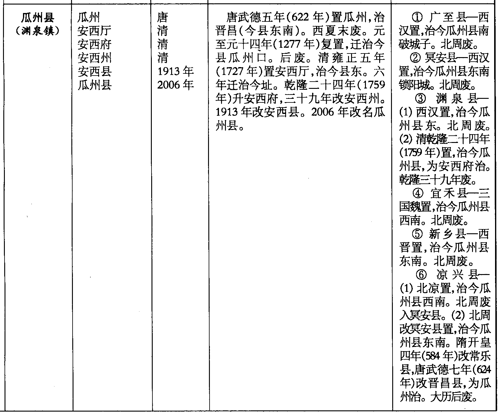 ❸ 渊泉县—(1)西汉置,治今瓜州县东。北周废。(2)清乾隆二十四年(1759年)置,治今瓜州县,为安西府治。乾隆三十九年废。
