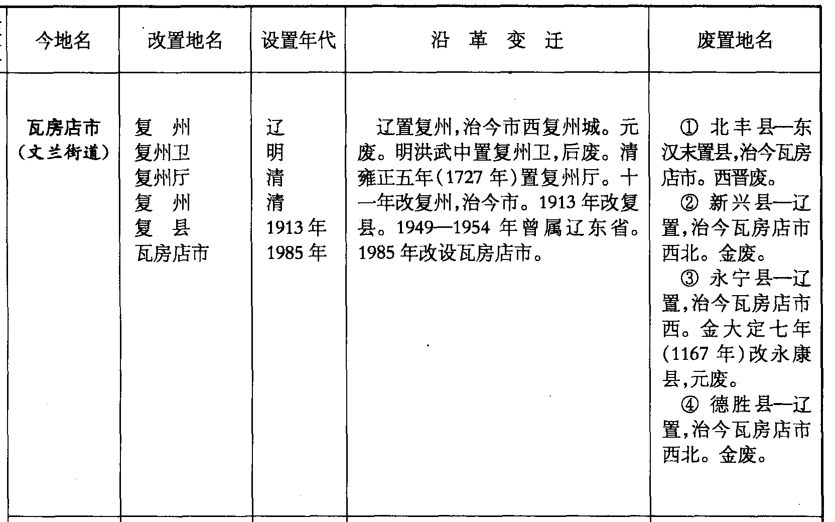 辽置复州,治今市西复州城。元废。明洪武中置复州卫,后废。清雍正五年(1727年)置复州厅。十一年改复州,治今市。1913年改复县。1949—1954年曾属辽东省。1985年改设瓦房店市。