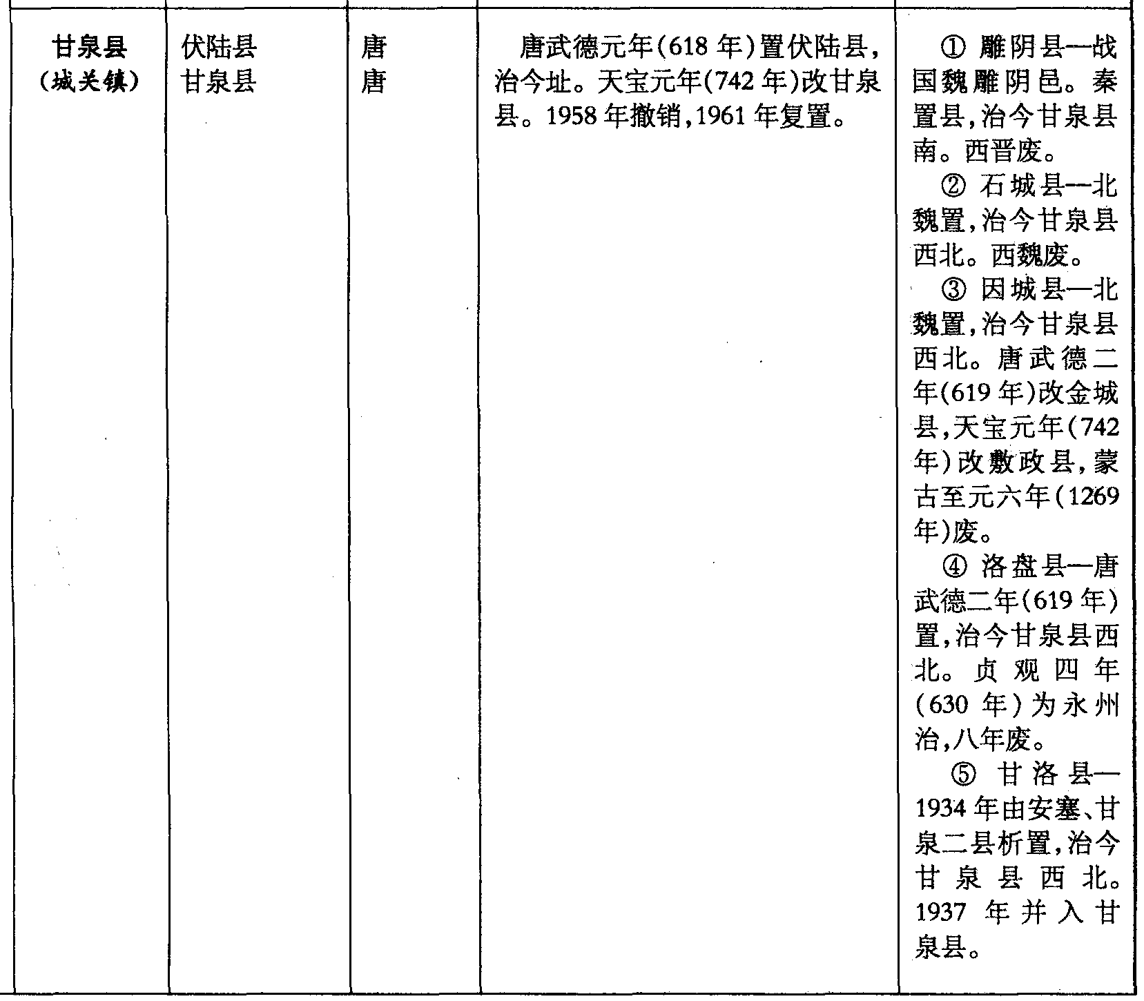甘泉县(城关镇)伏陆县甘泉县唐唐唐武德元年(618年)置伏陆县,治今址。天宝元年(742年)改甘泉县。1958年撤销,1961年复置。❶ 雕阴县—战国魏雕阴邑。秦置县,治今甘泉县南。西晋废。❷ 石城县—北魏置,治今甘泉县西北。西魏废。❸ 因城县—北魏置,治今甘泉县西北。唐武德二年(619年)改金城县,天宝元年(742年)改敷政县,蒙古至元六年(1269年)废。❹ 洛盘县—唐武德二年(619年)置,治今甘泉县西北。贞观四年(630年)为永州治,八年废。❺ 甘洛县—1934年由安塞、甘泉二县析置,治今甘泉县西北。1937年并入甘泉县。